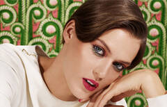 Das Zusammenspiel zwischen dem roséfarbenen Magic Shadow Mono 44 Flamingo und dem Automatic Pencil for Eyes Kohl Silk verleiht den Augen Ausdruck und Intensität. Den neuen Cream Gloss Dragonfruit mit den Fingern gleichmäßig auf die Lippen auftupfen. Somit erhält der Look ein zartes, glossiges Finish. Der Brilliant Nail Pink Magenta bildet mit seinem kräftigen Pinkton ein stimmiges Pendant zum Lippen–Make–up.